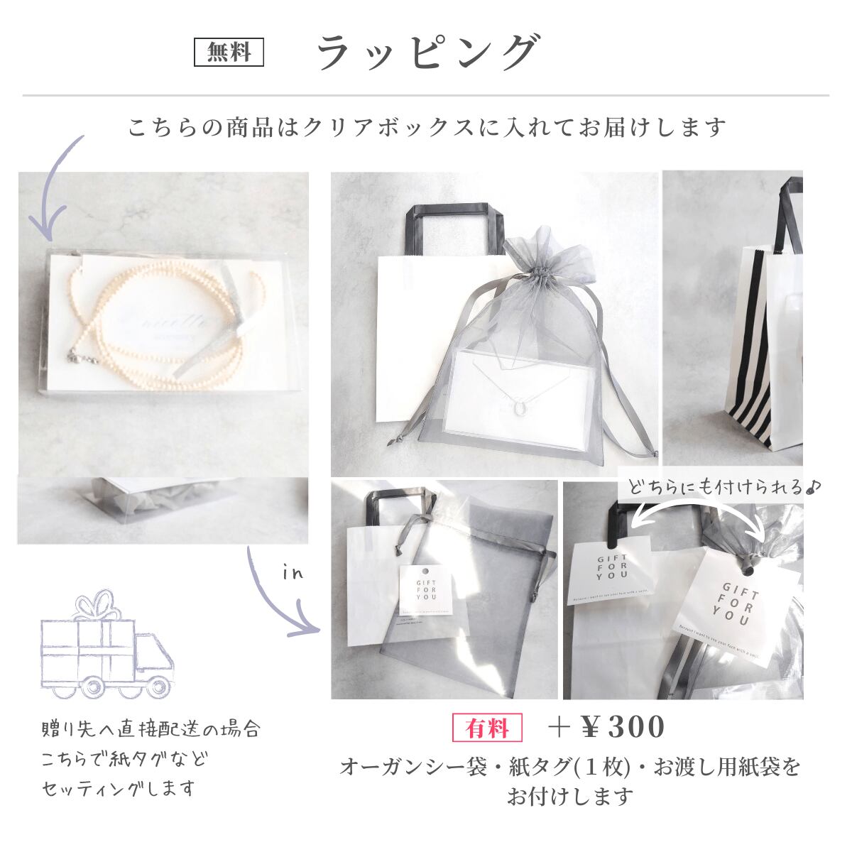 透明ケース(有料ラッピング相当)とジュエリークロス(約6cm四方・グレー)をお付けします♪