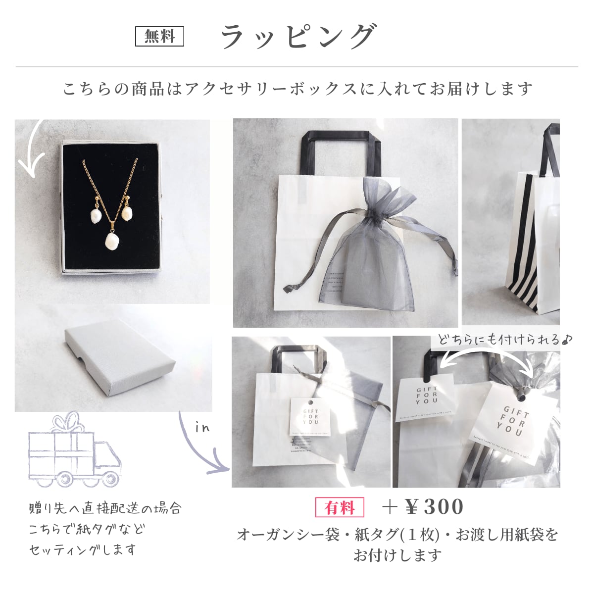 グレーのアクセサリーボックスに入れてお届けします