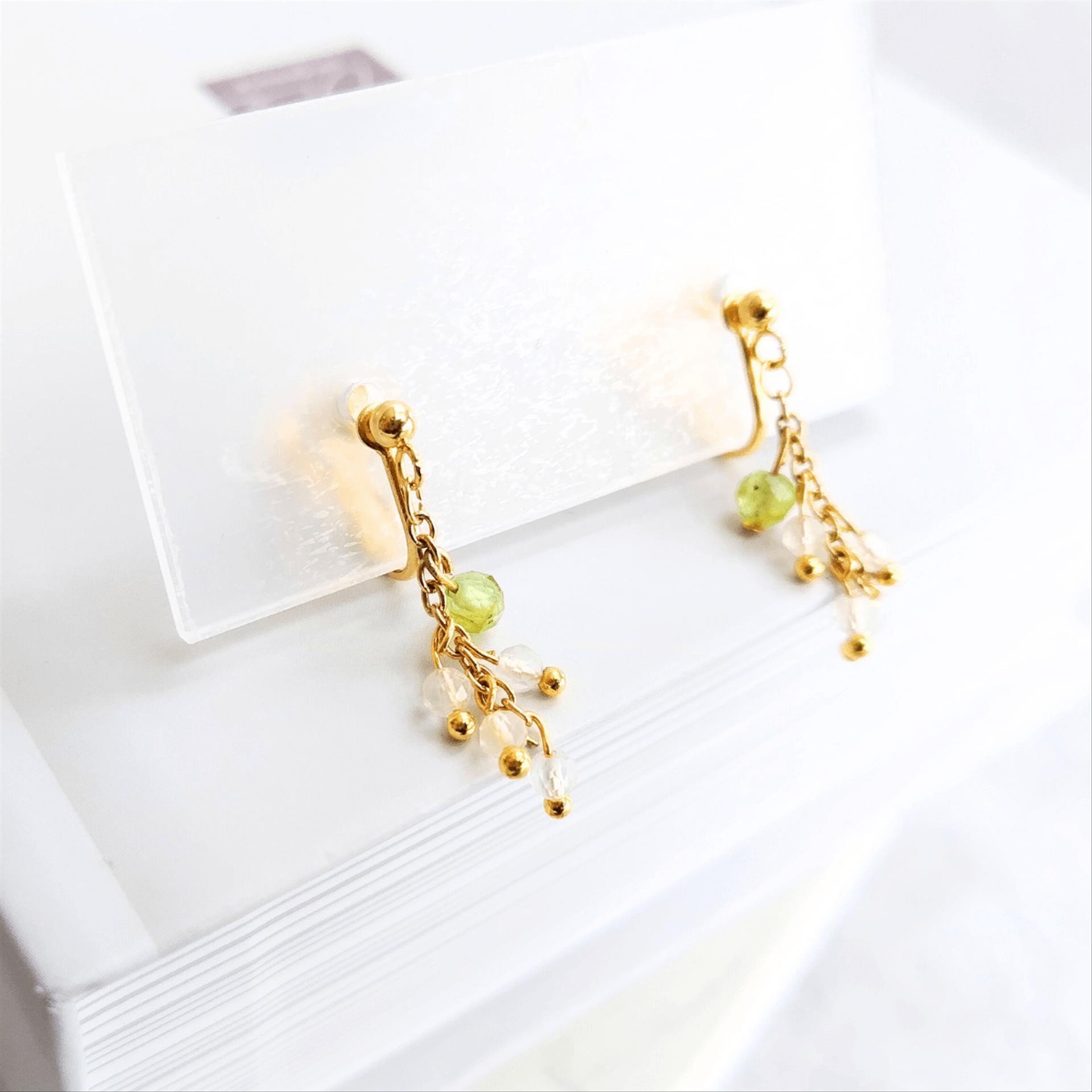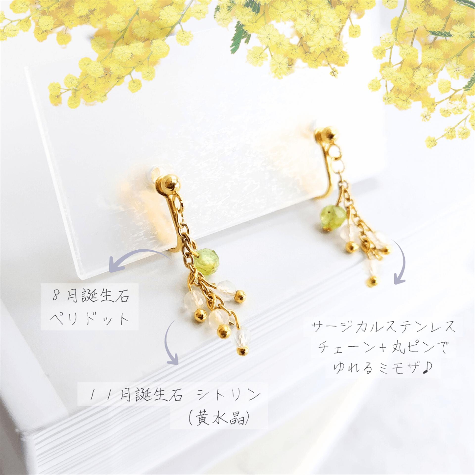 ミモザイメージ春限定❀ 天然石 シトリン&ペリドット 揺れる イヤリング / ピアス 痛くない 金属アレルギー対応 落ちない シンプル カジュアル おしゃれ 大人 ゴールド 誕生日プレゼント 卒業式 入学式