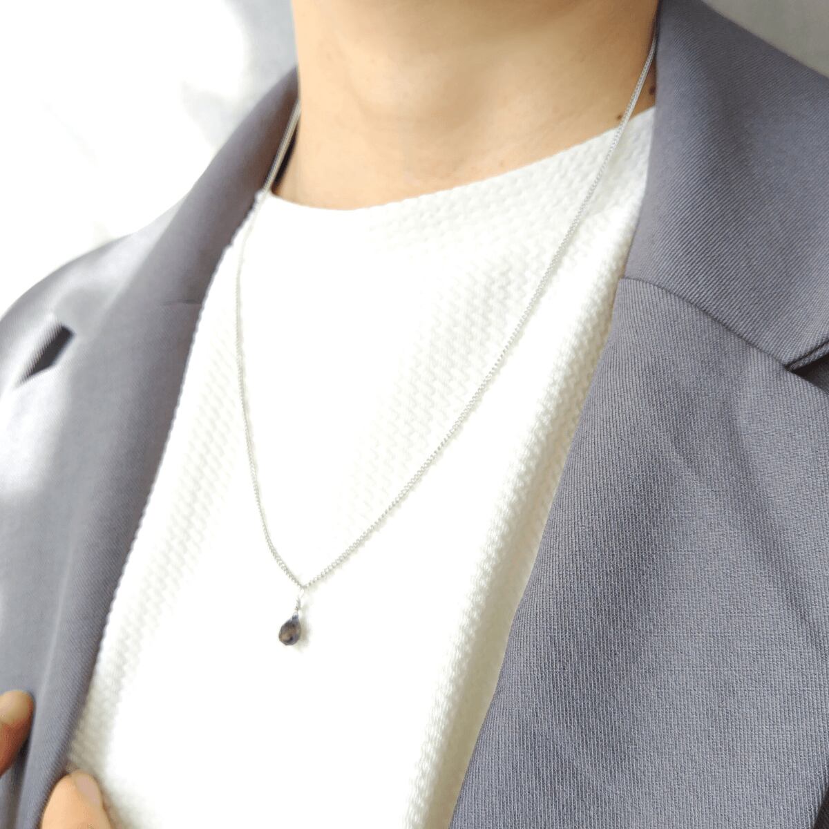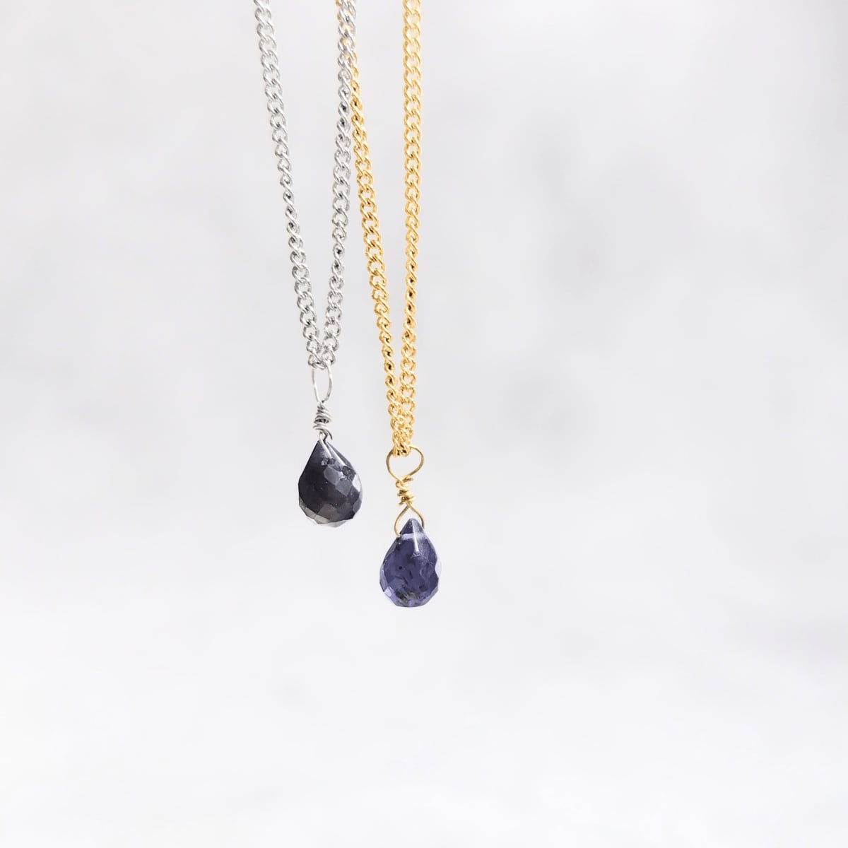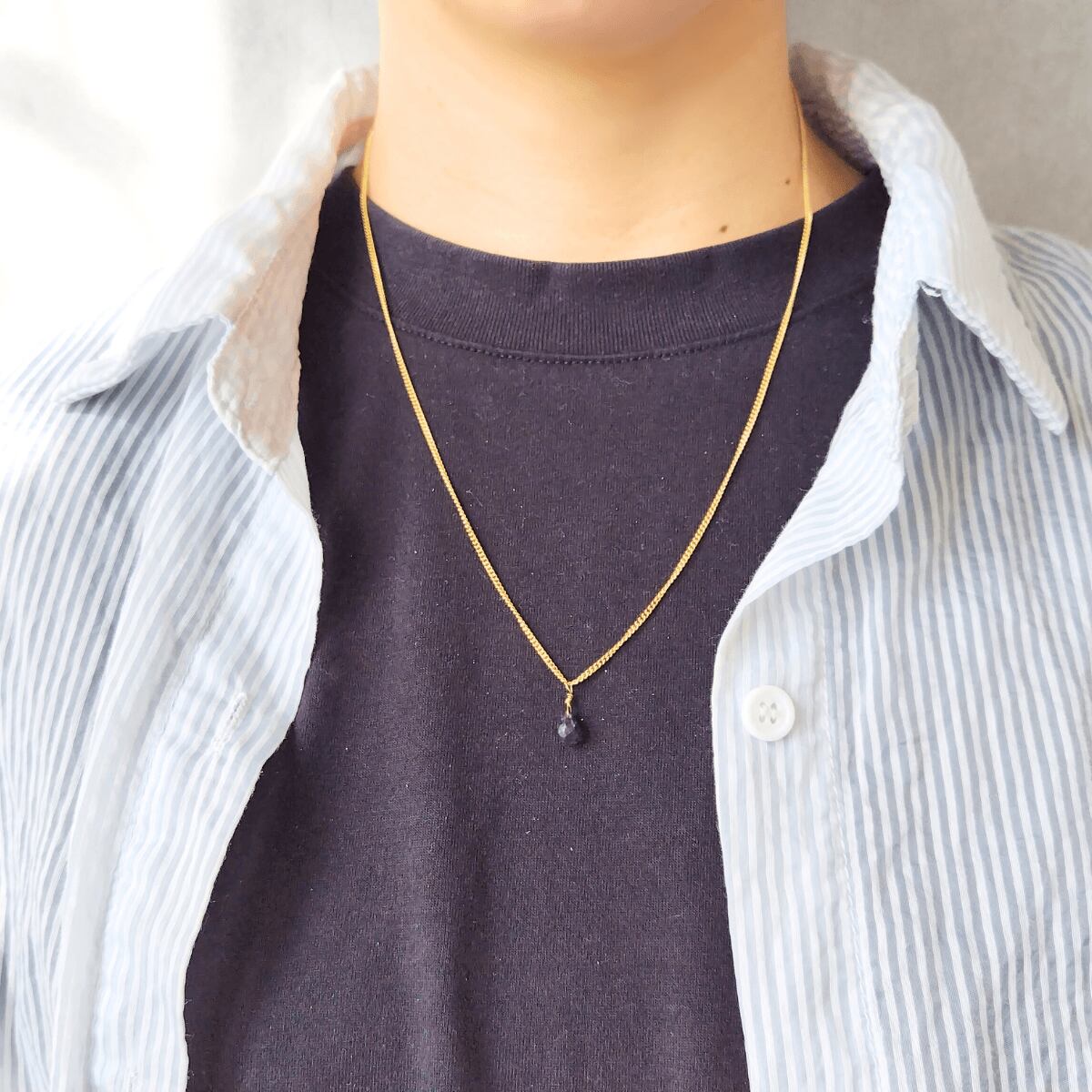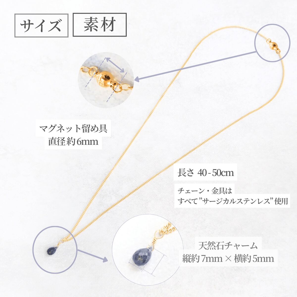 "簡単着脱" 一粒 ドロップ 3月誕生石 アイオライト マグネット留め具ネックレス 金属アレルギー対応 長さ調整 アジャスター スライドボール 青 ゴールド / シルバー 重ね付け 高見え フォーマル 上品 シンプル レディース