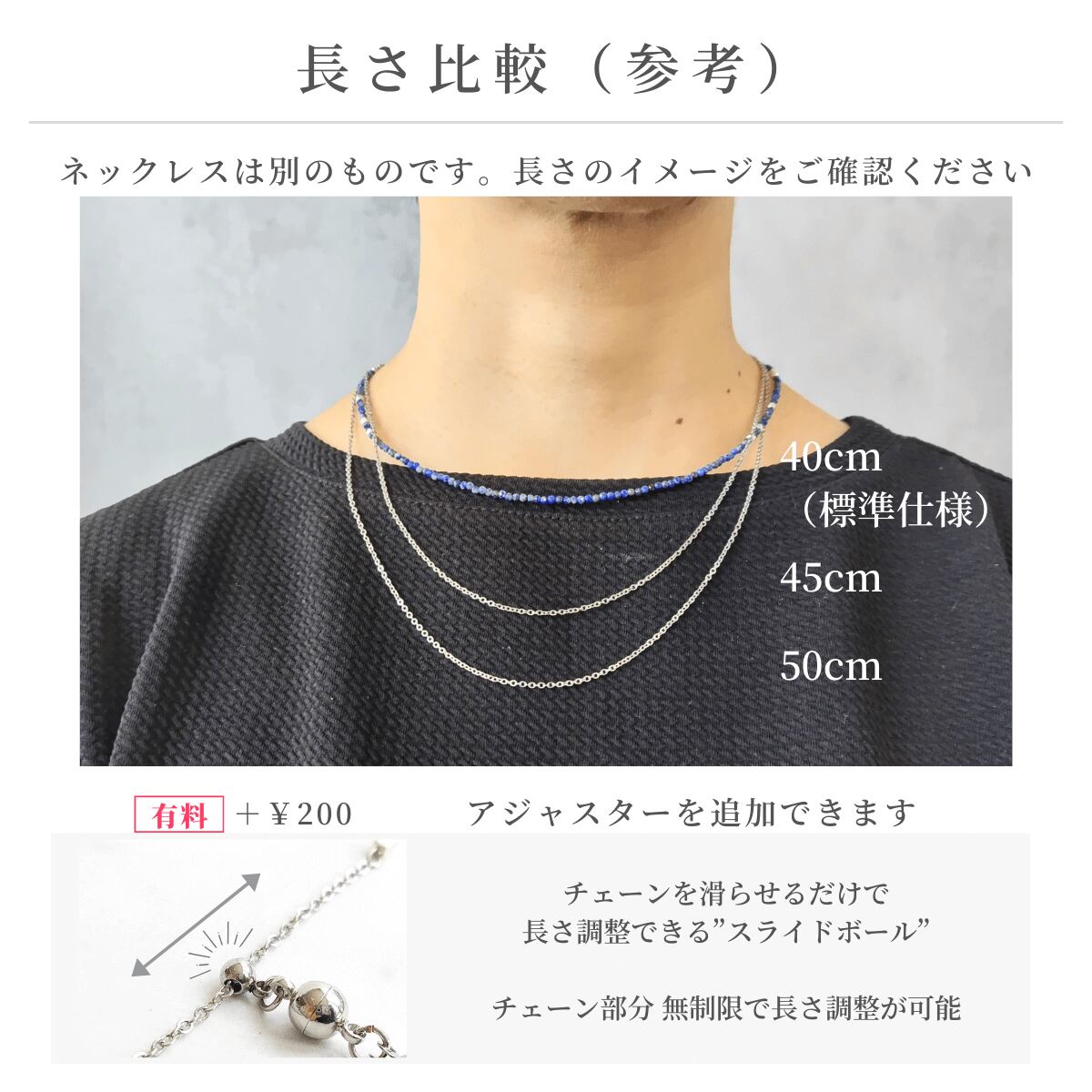 ・40cm:首元にフィット・すっきり見える、上品に決まる長さ